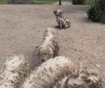 The dogs, identified as poodle mixes often called doodles, appeared confused and uneasy. Many stayed close together, as if seeking comfort from one another. Some hesitated to move, weighed down by their matted fur. Others wandered nervously, unsure of who to trust.