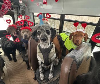 Before most people had even finished their morning coffee on Valentine’s Day, something extraordinary was happening inside a bright yellow school bus in a quiet Wisconsin town. Nearly two dozen dogs sat patiently in their seats, their tails wagging softly as they balanced heart-shaped headbands between their ears. There was no barking chaos or restless pacing. Instead, the bus felt calm and full of quiet anticipation. At the center of it all was Hope Mehlberg, moving down the aisle with gentle encouragement and treats, orchestrating a moment that looked almost impossible.