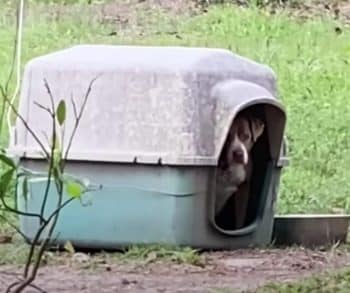 The pup was older now, her muzzle slightly grayed with age. She had likely spent days confined to that small space, tied up in the yard of the only home she had ever known. No explanation. No comfort. Just silence.