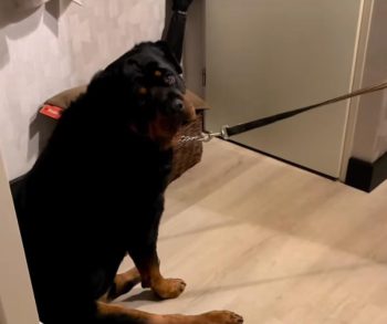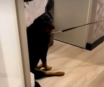 The video, shared by Instagram user @dycederottwelier, begins near the front door as Dyce’s dad prepares for what should be a normal walk. The leash is already clipped on. The door is right there. Everything looks perfectly ready for a quick outing.