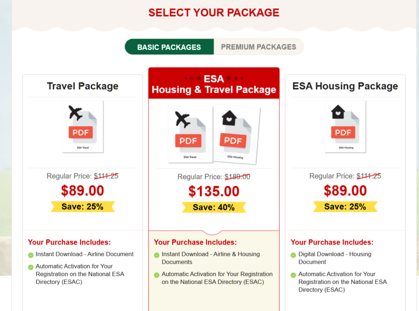 After you’re done answering questions, you’ll choose which package you want. You can choose between a travel letter, a housing letter, or both. Once you get to the checkout page, you can also add on optional upgrades, like getting a hard copy letter by mail (versus one emailed to you that you print out yourself), rush processing, training courses, or an emotional support vest for your dog.