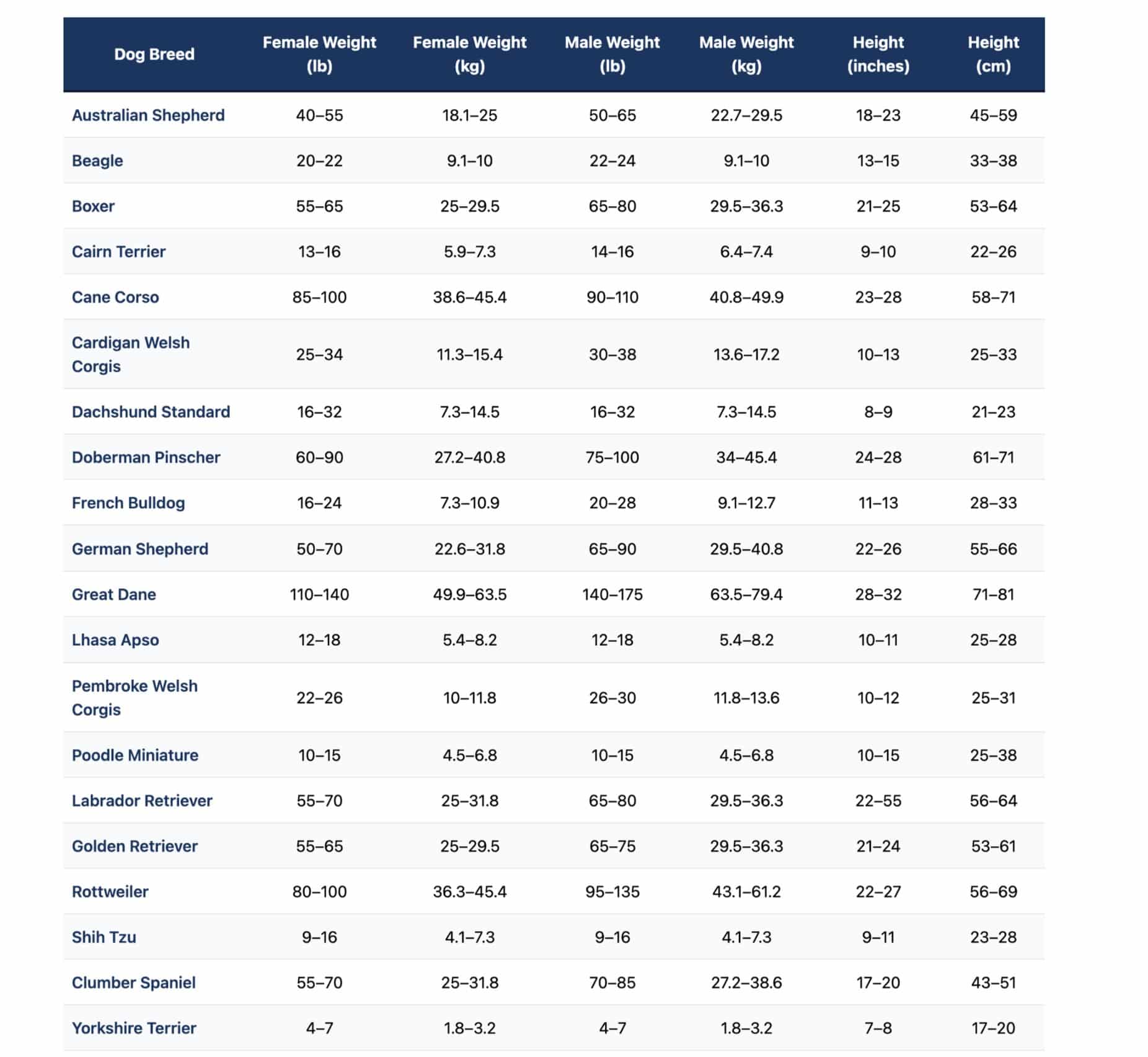 Determining a dog’s healthy weight is not as easy as looking at a chart of average age and breed weights (though that can give you a place to start). As a rule of thumb, a dog at a healthy weight should have a visible waist when you look at them from the side and from above, though we encourage you to talk to your veterinarian when determining an exact number. To give you some quick direction, here are some common weights by breeds, provided by the Association for Pet Obesity Prevention:
