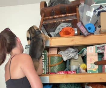 The little dog carefully scanned each level, his nose working with quiet determination. Then suddenly, his body language shifted. He fixated on a specific spot on the top shelf and began fussing, clearly trying to communicate something important. Curious and slightly confused, Riley reached up to check.