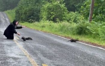 The babies were far too young to recognize the threat of passing cars. They stayed still, as though frozen, relying on instinct yet unprepared to survive such a close call. Natalie knew she could not leave them where they were. Stepping carefully, she used slow, gentle movements to guide the pups away from the road. Her goal was not to touch them, but to usher them toward safety without frightening them or disrupting the nearby mother.